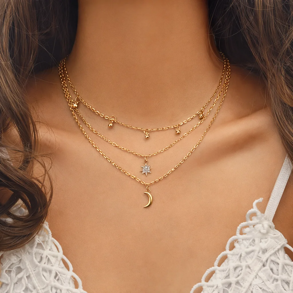 Destiny Jewels Gold Plated Multi-Layer Beads Choker Moon and Star Pendant Necklace For Women and Girls