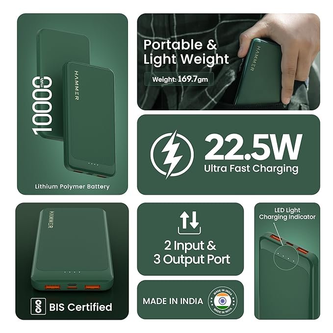Hammer Ultra Charge 10000mAh 22.5Watts PowerBank 20Watts PD Fast Charging, 3 Output, 2 Input Ports Type-C/PD, Micro USB and Multiple Layers of Protection (Green)